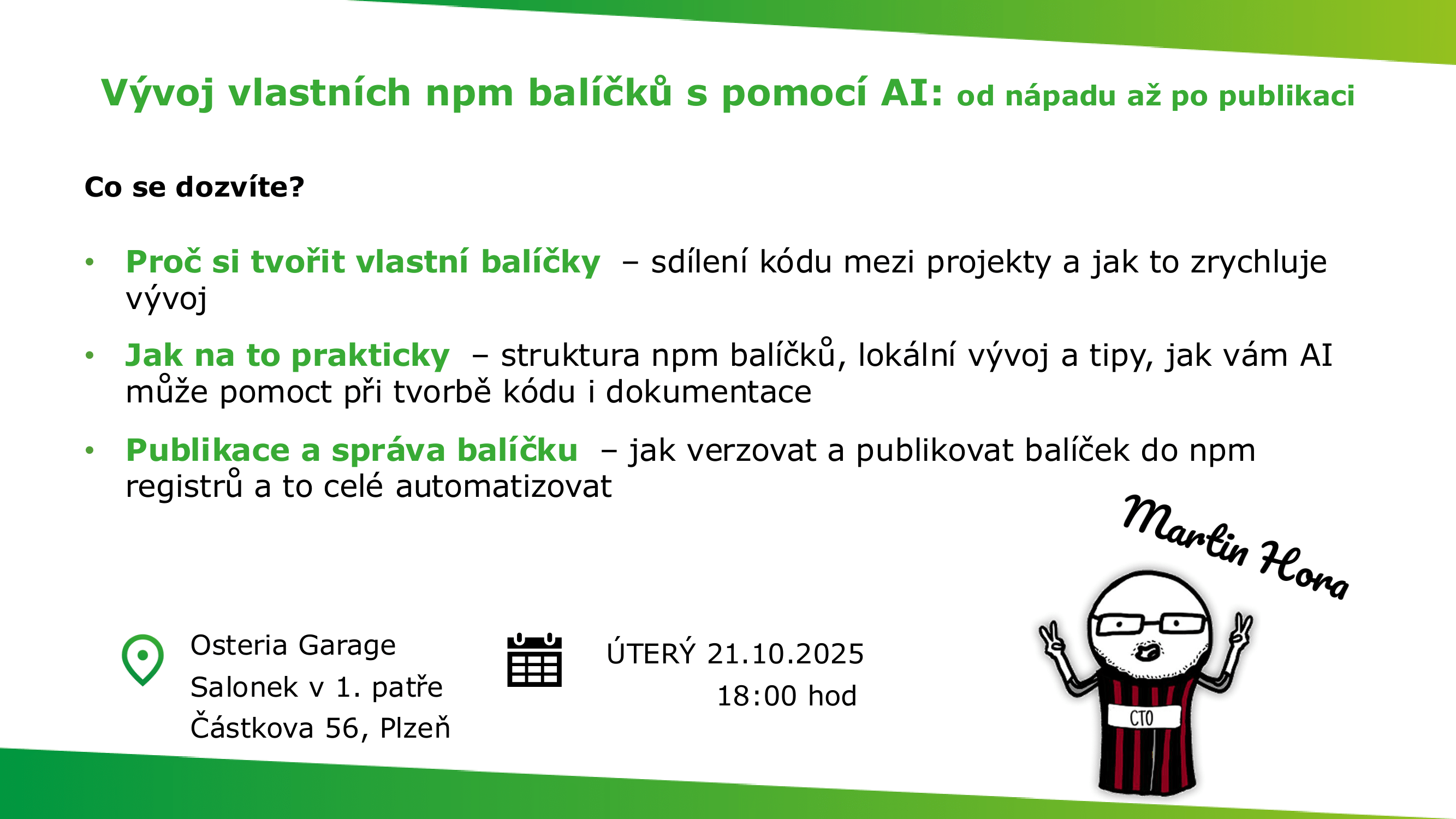 - Jak na to prakticky – struktura npm balíčků, lokální vývoj a tipy, jak vám AI může pomoct při tvorbě kódu i dokumentace